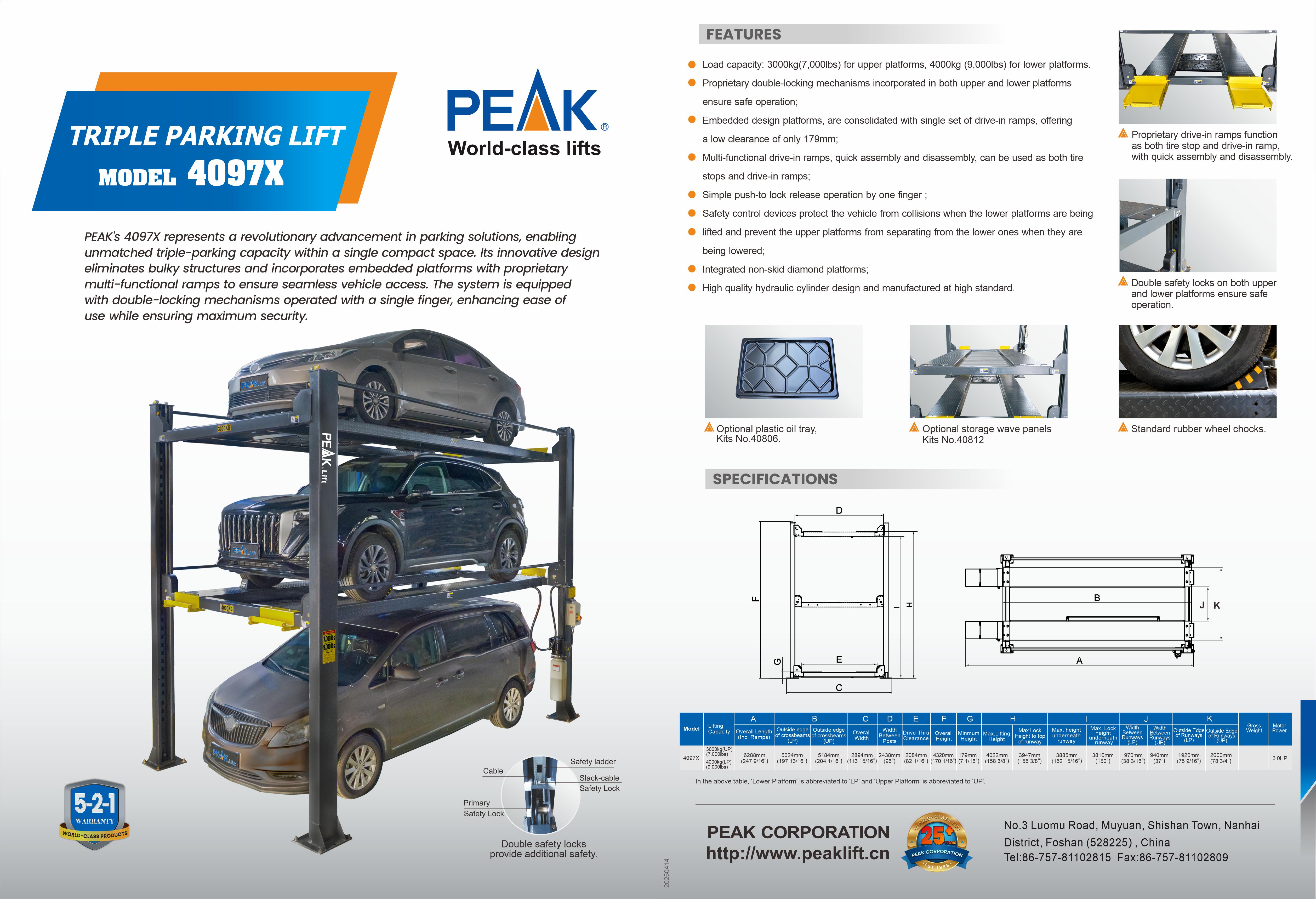 PEAK's 4097X represents a revolutionary advancement in parking solutions, enabling unmatched triple-parking capacity within a single compact space. Its innovative design eliminates bulky structures and incorporates embedded platforms with proprietary multi-functional ramps to ensure seamless vehicle access. The system is equipped with double-locking mechanisms operated with a single finger, enhancing ease of use while ensuring maximum security.