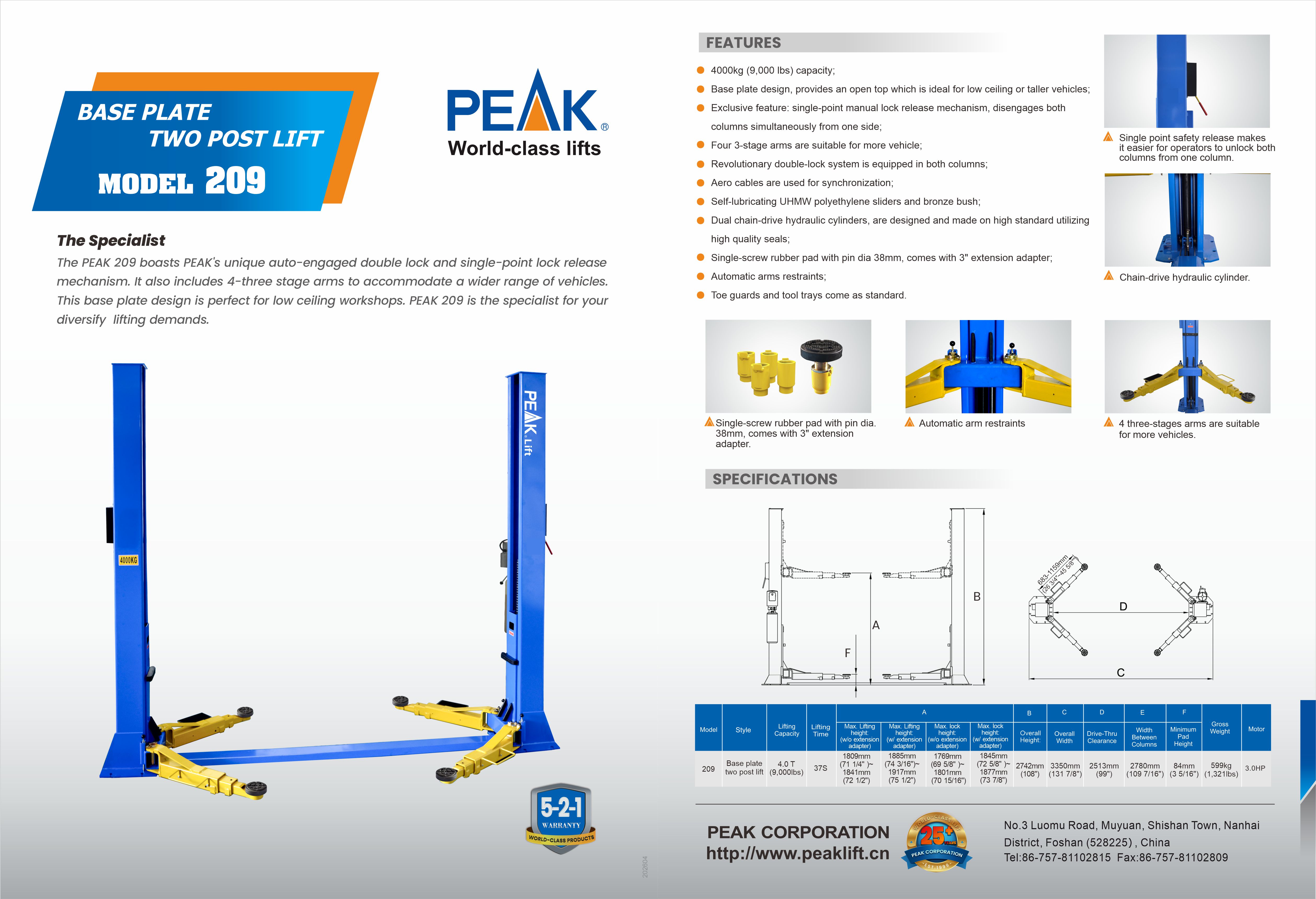The PEAK 209 boasts PEAK's unique auto-engaged double lock and single-point lock release mechanism. It also includes 4-three stage arms to accommodate a wider range of vehicles. This base plate design is perfect for low ceiling workshops. PEAK 209 is the specialist for your diversify lifting demands.