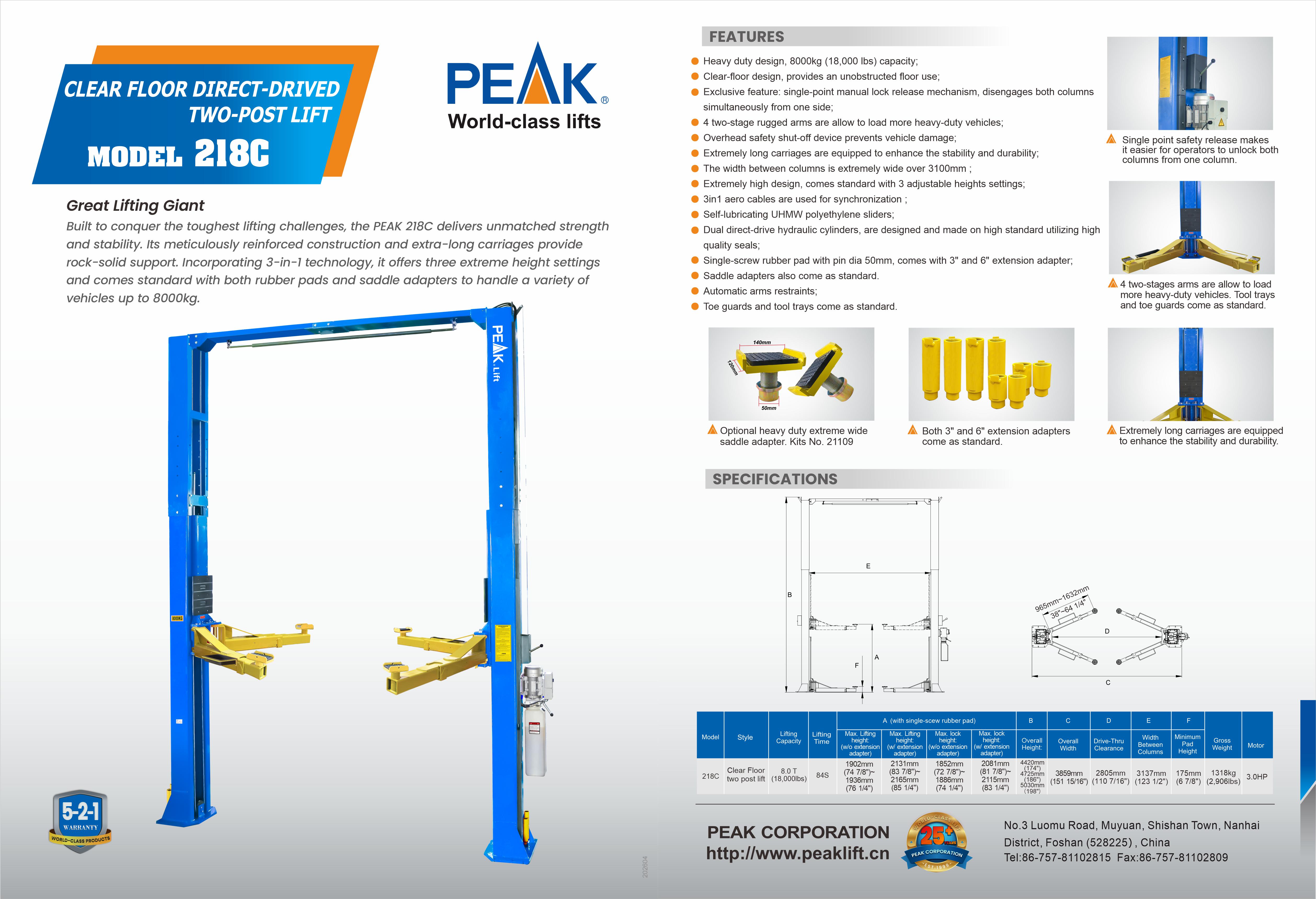 Built to conquer the toughest lifting challenges, the PEAK 218C delivers unmatched strength and stability. Its meticulously reinforced construction and extra-long carriages provide rock-solid support. Incorporating 3-in-1 technology, it offers three extreme height settings and comes standard with both rubber pads and saddle adapters to handle a variety of vehicles up to 8000kg.