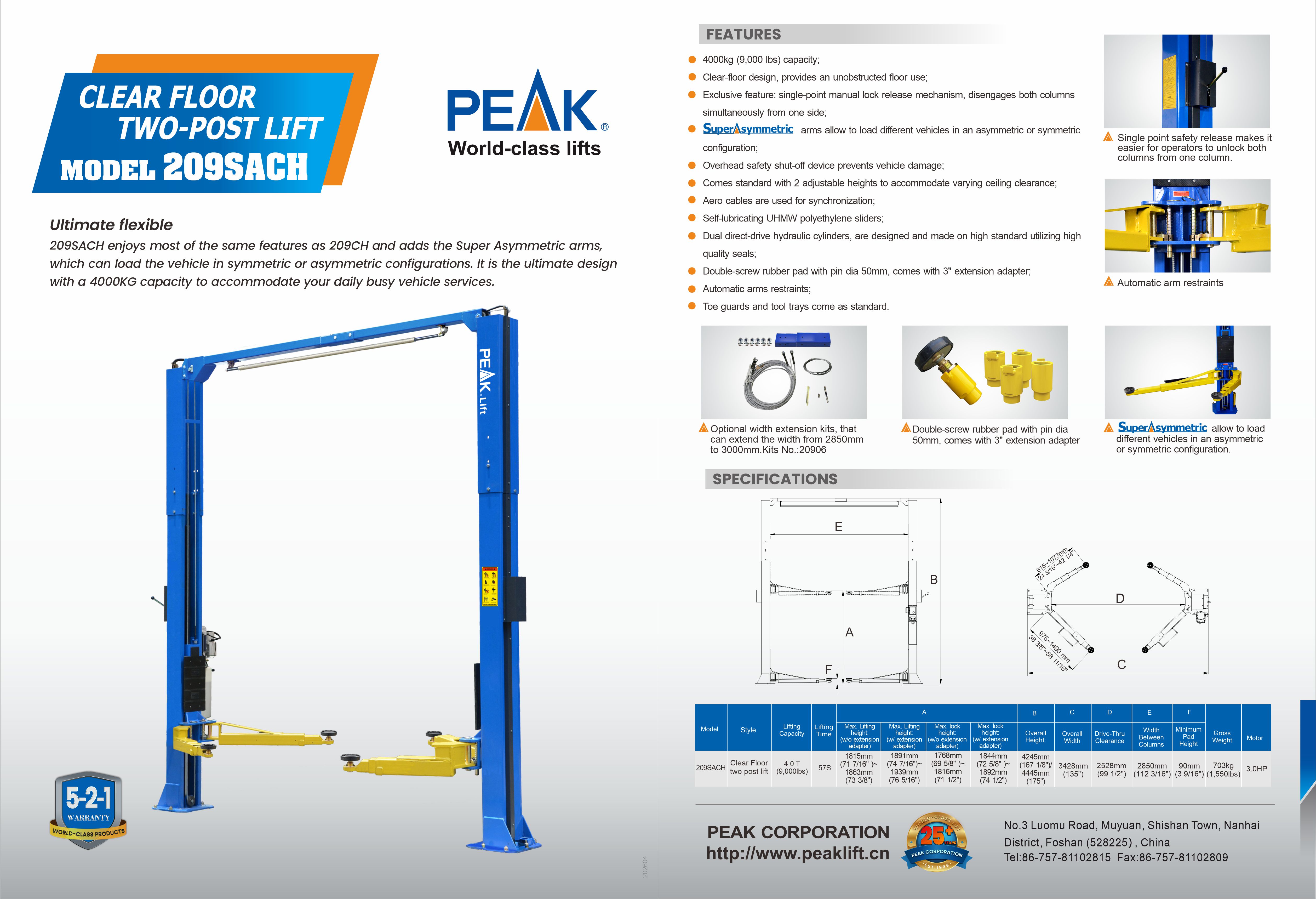 209SACH enjoys most of the same features as 209CH and adds the Super Asymmetric arms, which can load the vehicle in symmetric or asymmetric configurations. It is the ultimate design with a 4000KG capacity to accommodate your daily busy vehicle services.