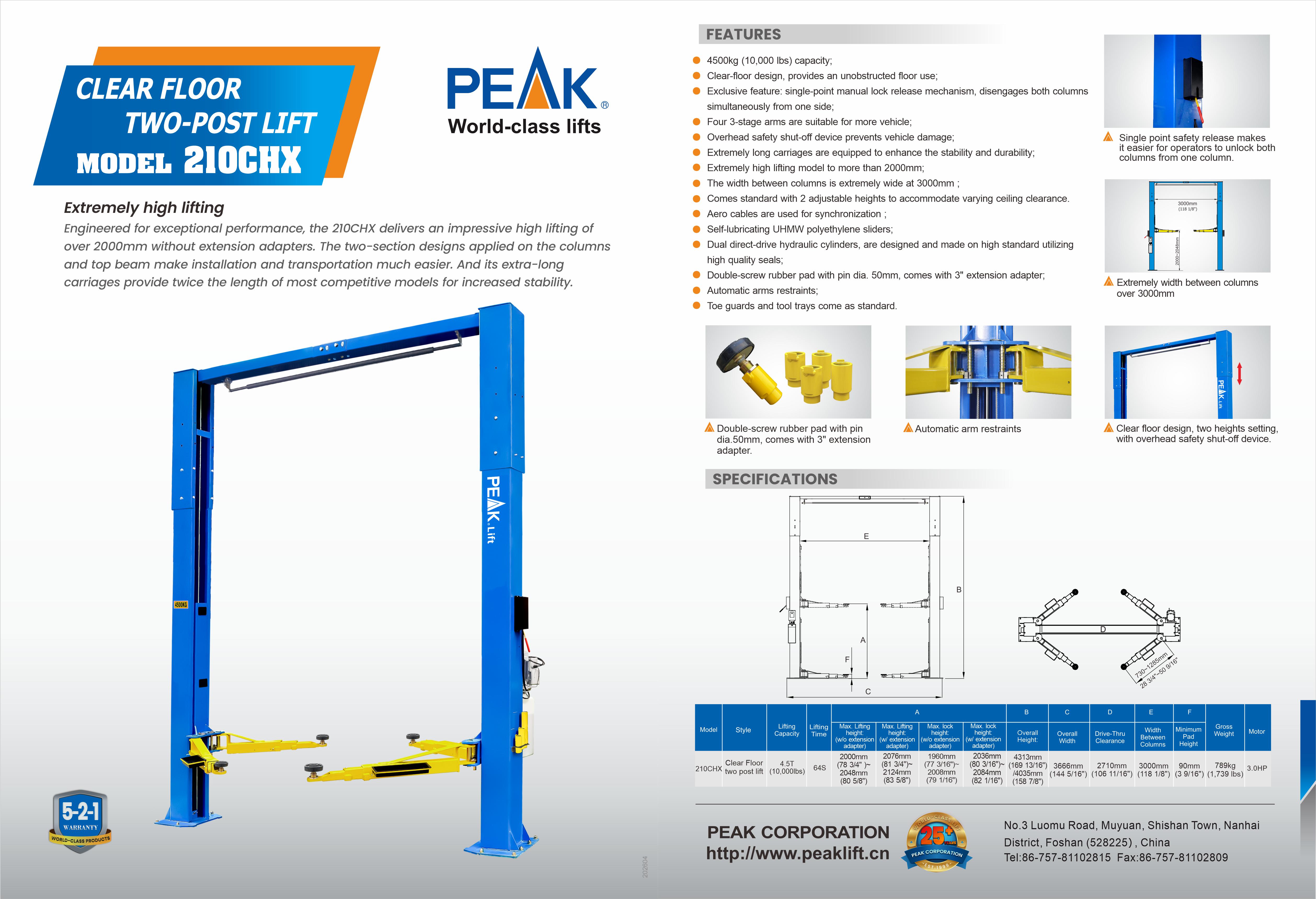 Engineered for exceptional performance, the 210CHX delivers an impressive high lifting of over 2000mm without extension adapters. The two-section designs applied on the columns and top beam make installation and transportation much easier. And its extra-long carriages provide twice the length of most competitive models for increased stability.