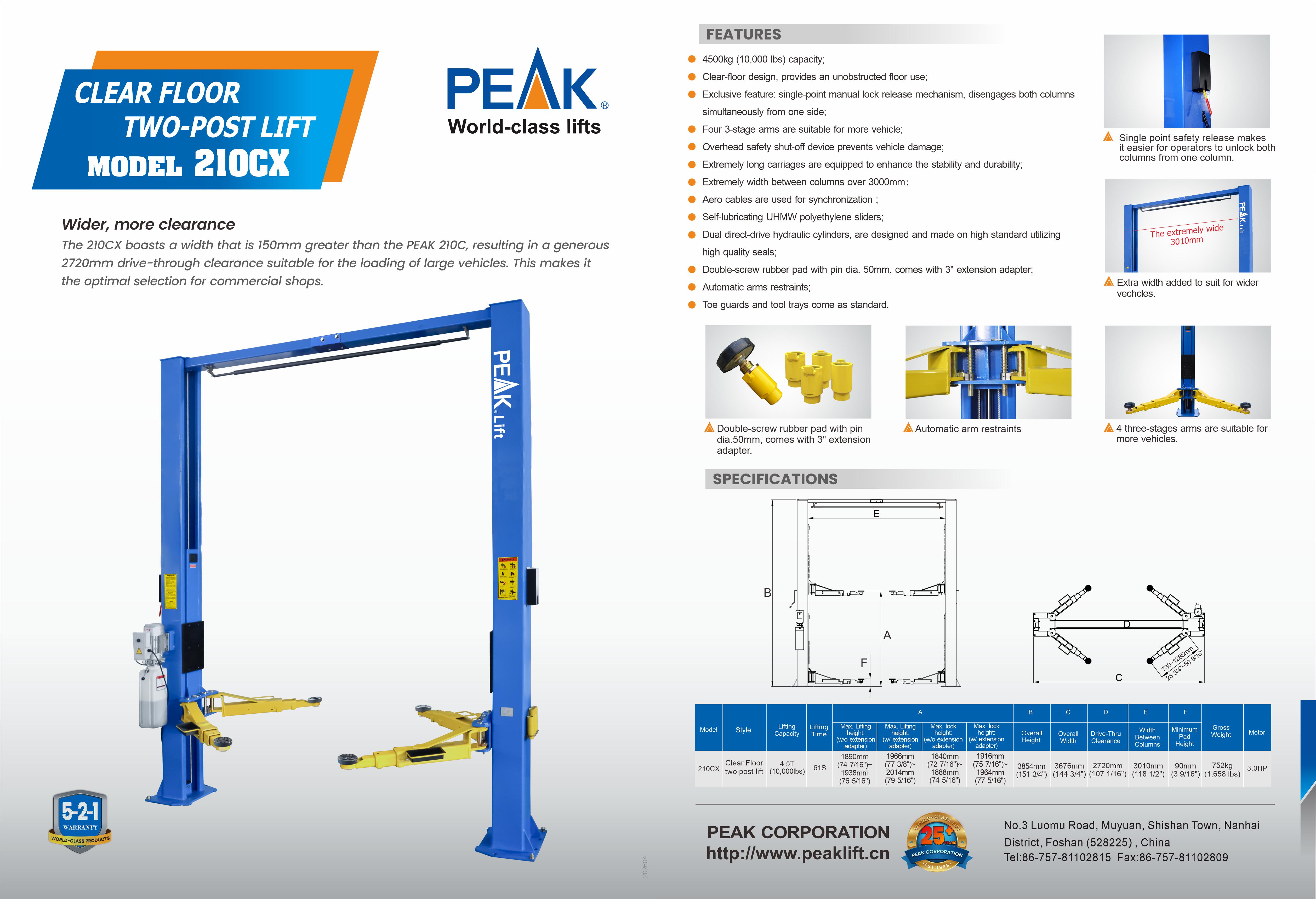 The 210CX boasts a width that is 150mm greater than the PEAK 210C, resulting in a generous 2720mm drive-through clearance suitable for the loading of large vehicles. This makes it the optimal selection for commercial shops.