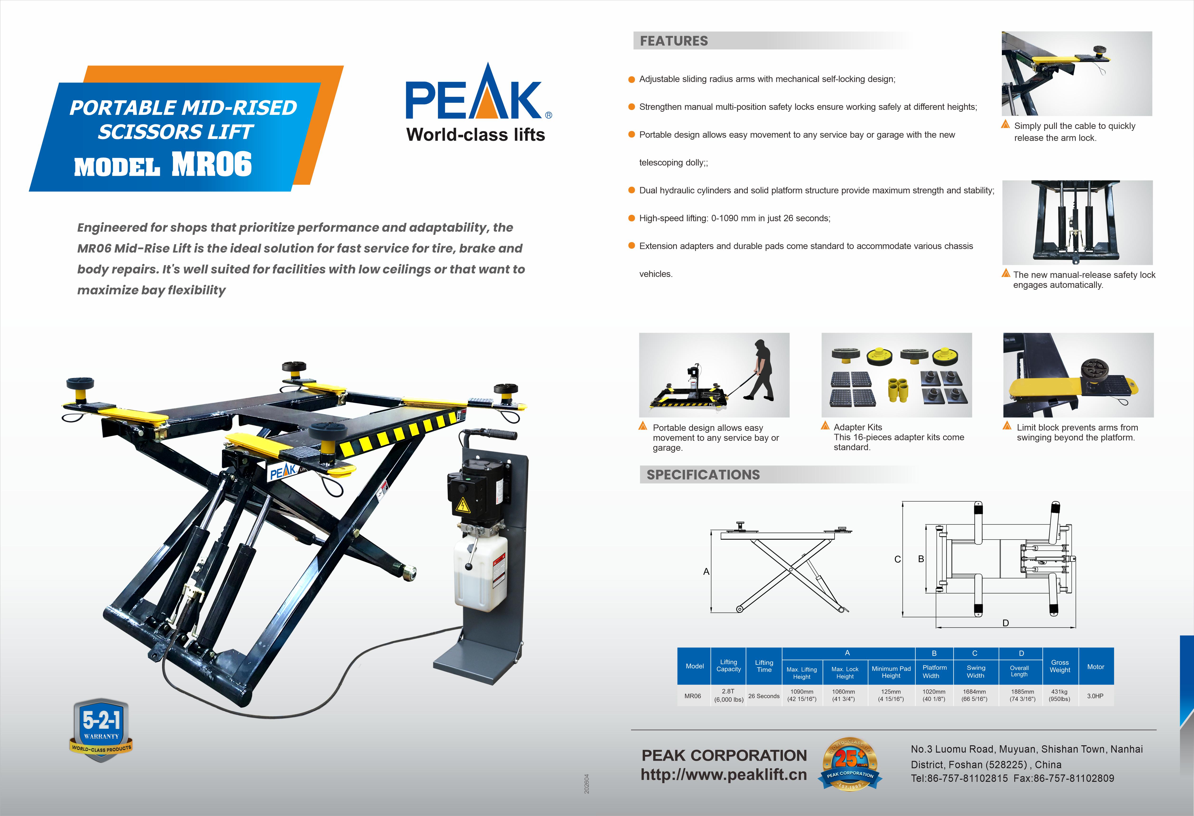 Engineered for shops that prioritize performance and adaptability, the MR06 Mid-Rise Lift is the ideal solution for fast service for tire, brake and body repairs. It's well suited for facilities with low ceilings or that want to maximize bay flexibility