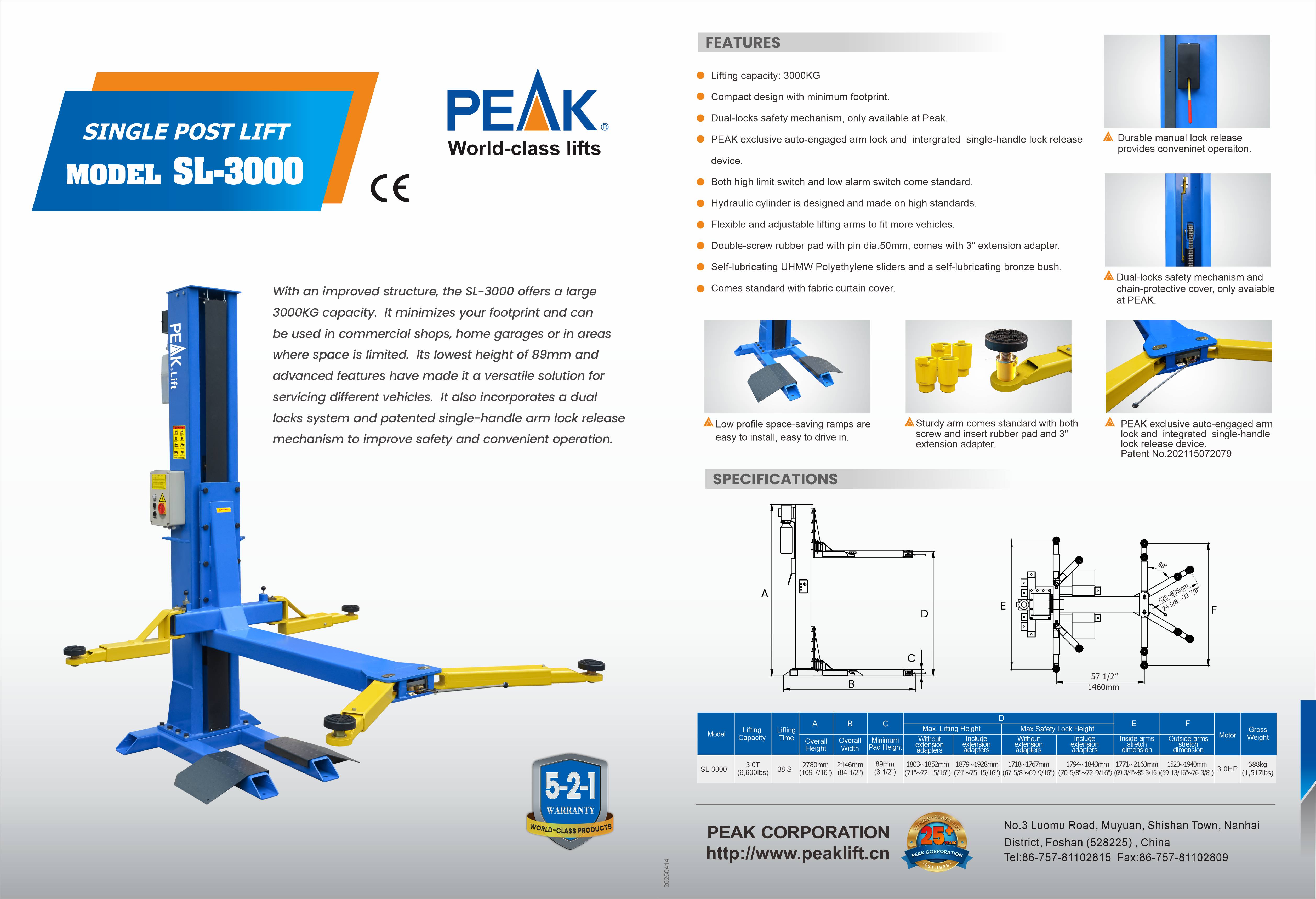 With an improved structure, the SL-3000 offers a large 3000KG capacity. It minimizes your footprint and can be used in commercial shops, home garages or in areas where space is limited. Its lowest height of 89mm and advanced features have made it a versatile solution for servicing different vehicles. It also incorporates a dual-lock system and patented single-handle arm lock release mechanism to improve safety and convenient operation.