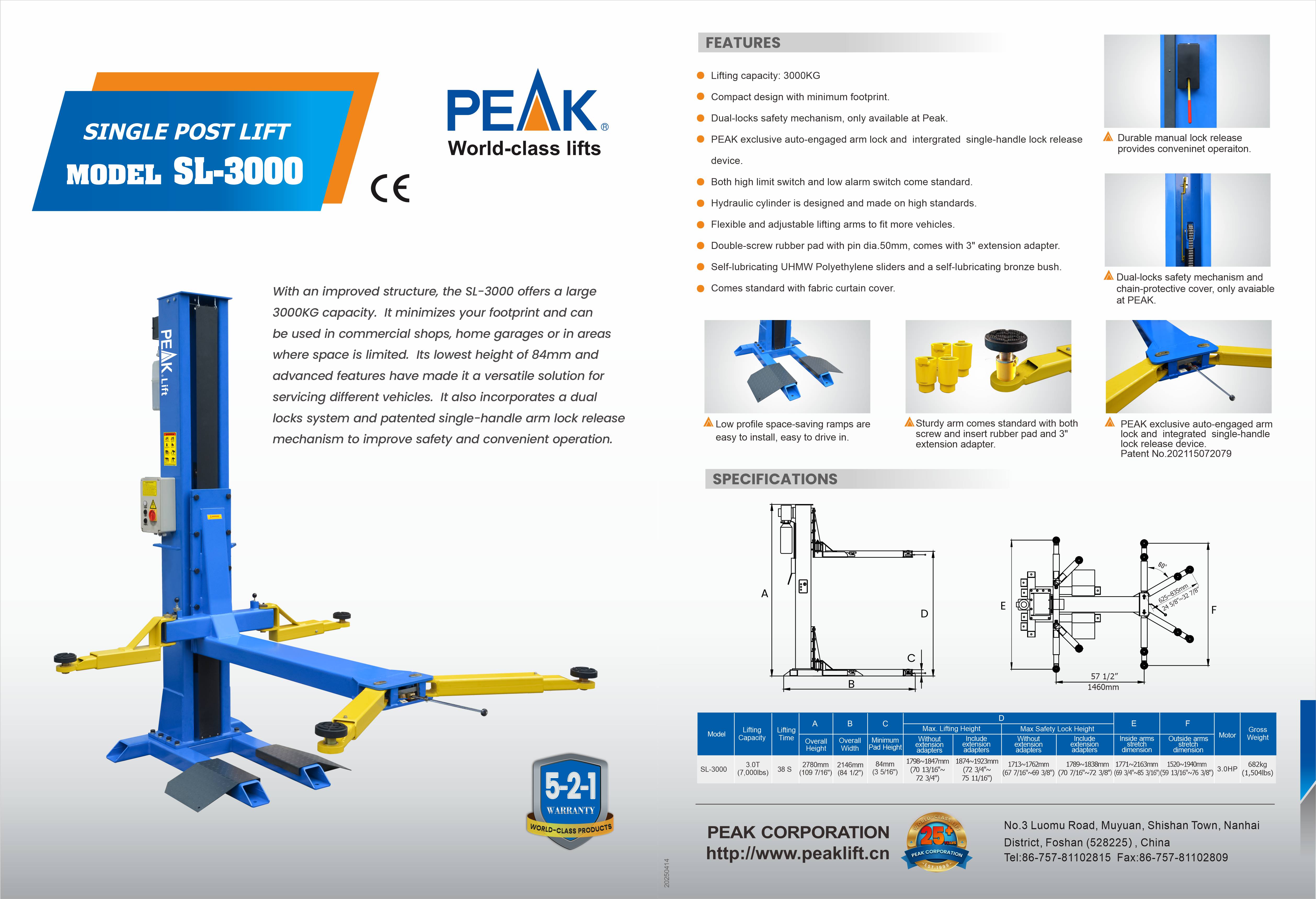 With an improved structure, the SL-3000 offers a large 3000KG capacity. It minimizes your footprint and can be used in commercial shops, home garages or in areas where space is limited. Its lowest height of 84mm and advanced features have made it a versatile solution for servicing different vehicles. It also incorporates a dual-lock system and patented single-handle arm lock release mechanism to improve safety and convenient operation.