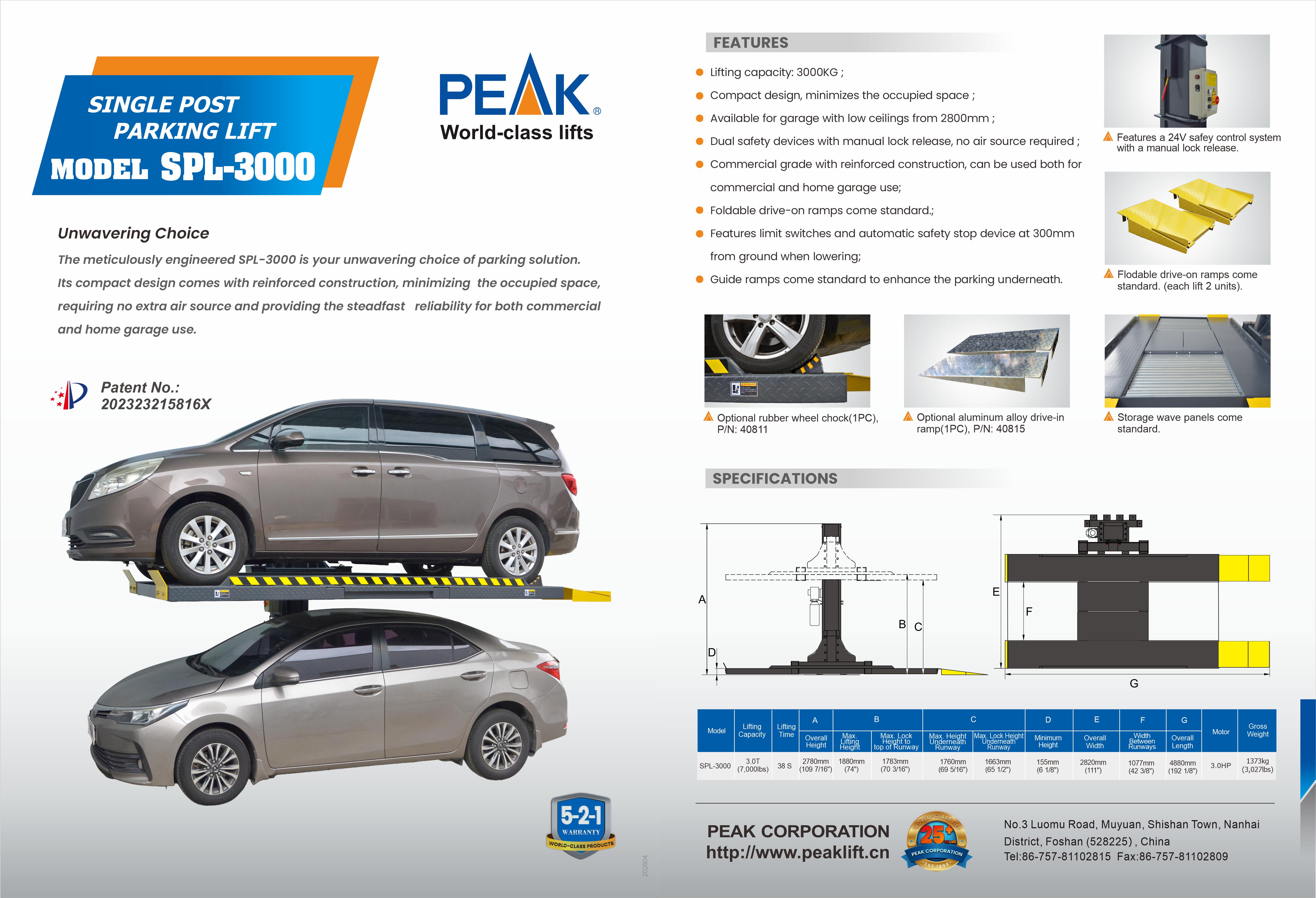 | Model SPL-3000 | Single Post Parking Lift | |